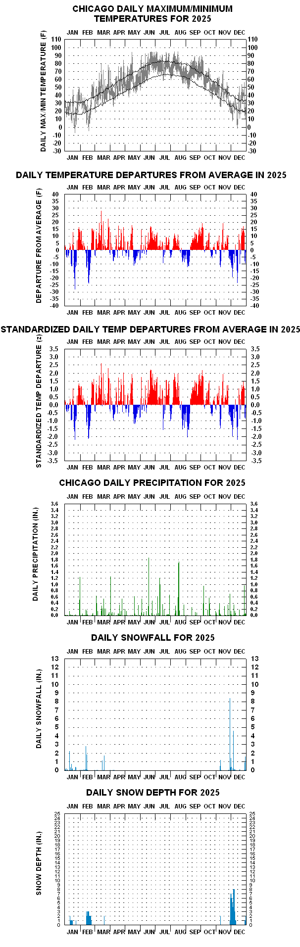 The following is a graphical climatology of Chicago, Illinois temperatures, precipitation, and snowfall, from the 1870’s at the earliest (temperature and precipitation) into 2025.  The graphics consist of summary overview charts followed by year-to-year graphs that depict daily temperature, precipitation, and snowfall. The daily precipitation observations date from the start of 1871, temperatures from 10 June 1872, snowfall from the 1885-6 season, and snow depth from the beginning of 1901.