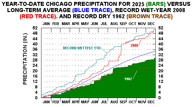Chicago 2025 Cumulative Daily Precipitation vs. Normals and Record Wettest & Driest YTD New (12/31/25)