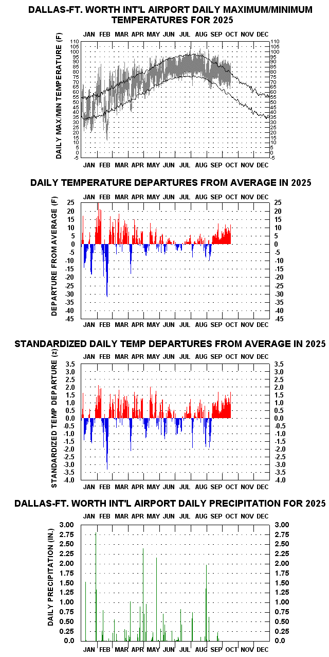 The following is a graphical climatology of Dallas-Fort Worth Int’l Airport Temperatures, precipitation, and various other variables, from 1948 into the present year 2025. Presented are daily climatological overview charts (temperature), annual time-series (temperature and precipitation), “climograms” (hour-by-month depictions of temperature, humidity, winds, fog, blowing sand/dust, and thunderstorms), followed by year-to-year graphs that depict daily max/min temperature, daily mean temperature anomalies, and daily rainfall, . Data were obtained courtesy of the Utah Climate Center and the NWS-Dallas/Fort Worth online site.Latest Update: 17 Oct 2025 e-mail contact: cjfisk@att.net