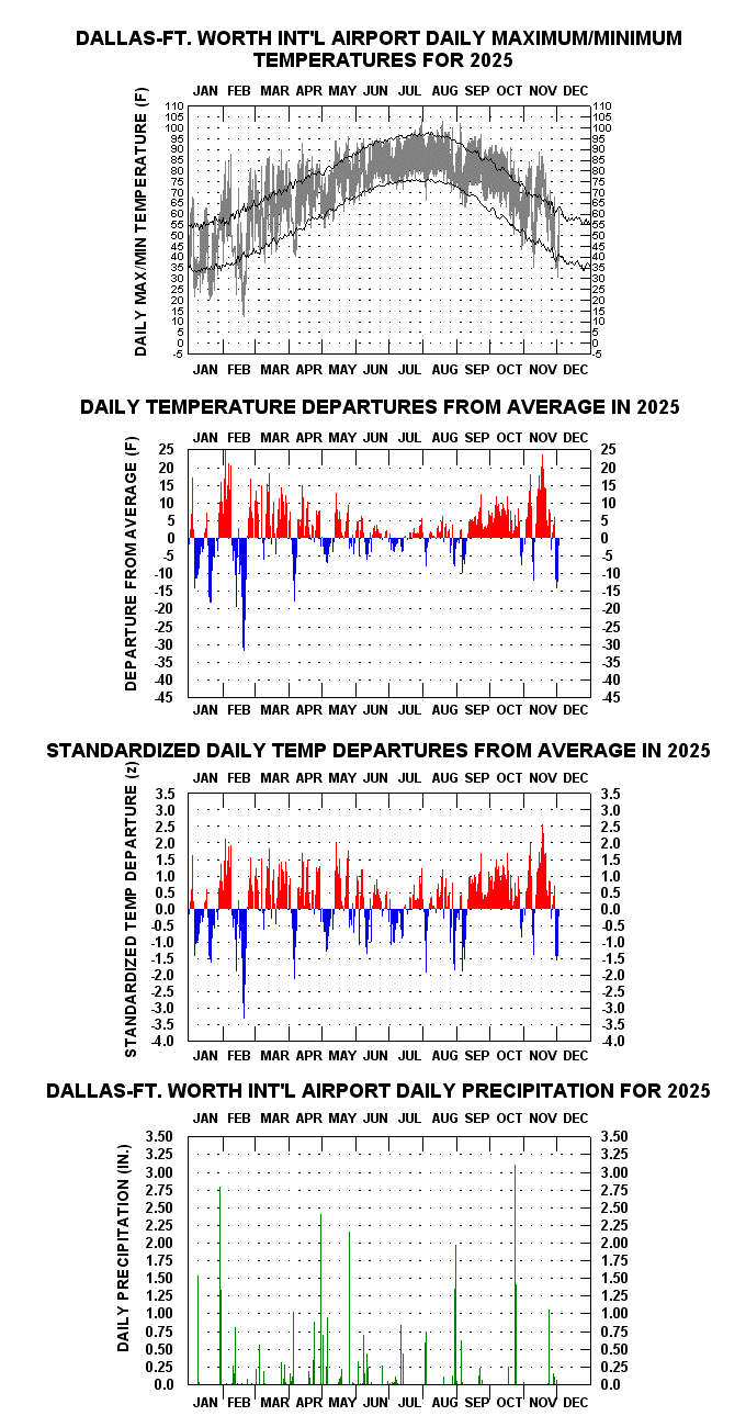 The following is a graphical climatology of Dallas-Fort Worth Int’l Airport Temperatures, precipitation, and various other variables, from 1948 into the present year 2025. Presented are daily climatological overview charts (temperature), annual time-series (temperature and precipitation), “climograms” (hour-by-month depictions of temperature, humidity, winds, fog, blowing sand/dust, and thunderstorms), followed by year-to-year graphs that depict daily max/min temperature, daily mean temperature anomalies, and daily rainfall, . Data were obtained courtesy of the Utah Climate Center and the NWS-Dallas/Fort Worth online site.Latest Update: 3 Dec 2025 e-mail contact: cjfisk@att.net