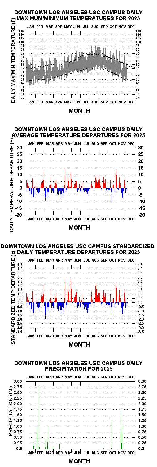 2025 Daily Temperature and Precipitation Chart for Downtown Los Angeles New (12/4/25)