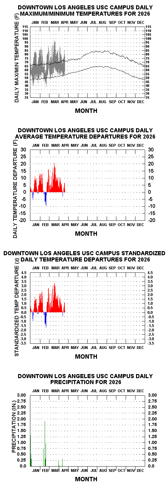 2026 Daily Temperature and Precipitation Chart for Downtown Los Angeles New (3/31/26)