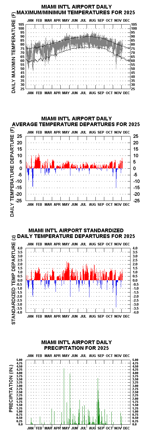 The following is a graphical climatology of Miami, Florida (International Airport) temperatures, precipitation, and various other parameters, from 1949 into the present year 2025. Presented are daily climatological overview charts (temperature and rainfall), annual time-series (temperature and rainfall), “climograms” (hour-by-month depictions of temperature, humidity, winds, Flying Weather, cloud ceilings, fog, and thunderstorms), followed by year-to-year graphs that depict daily max/min temperature, daily mean temperature anomalies, and daily rainfall. The year-to-year graphs go back to 1949, the annual rainfall series back to 1906.