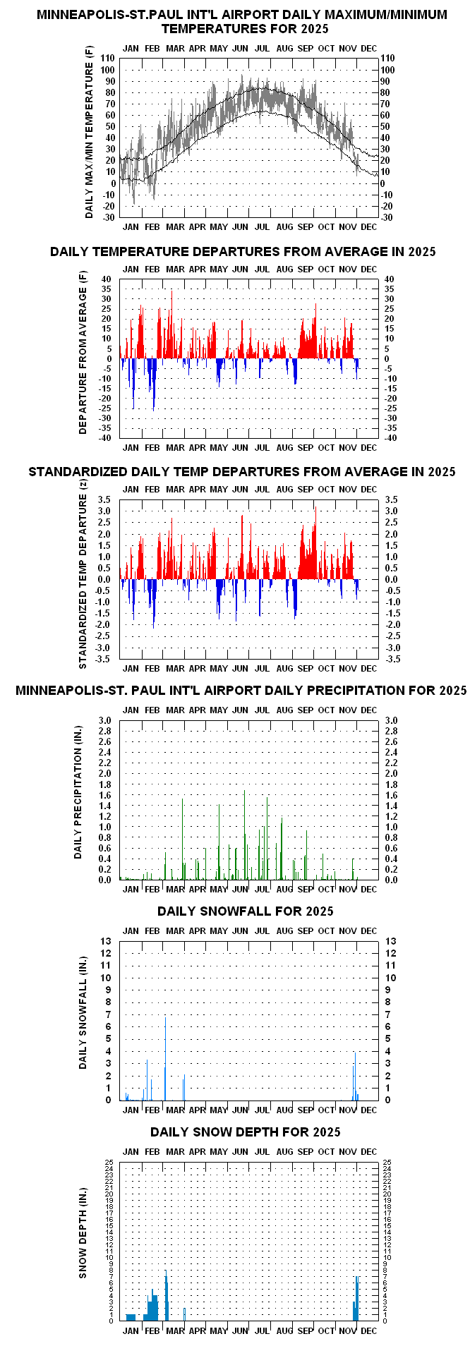 The following is a graphical climatology of Minneapolis-St. Paul, Minnesota temperatures, precipitation, and snowfall, from the start of 1820 (Fort Snelling) into the present year 2025. Presented are summary overview charts, a link to a year-by-year account of early (1820-1869) Minnesota weather history, followed by year-to-year graphs depicting daily temperatures, precipitation, and snowfall. Original source data are from Fort Snelling (1820-1858), St. Paul Smithsonian recordings (1859-1872); and government weather service observations for St. Paul (1873-1890), downtown Minneapolis (1890-1938), and the Minneapolis-St. Paul International Airport (1938-present). Daily snowfall totals date from 1891, snow depth data from 1893.