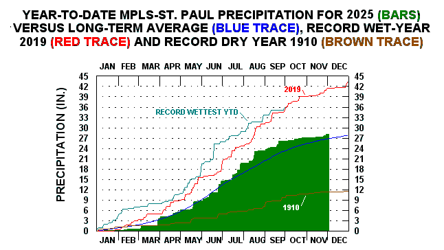 Minneapolis-St. Paul YTD Precipitation for 2025 vs. Long-Term Average & Extremes New (10/31/25)