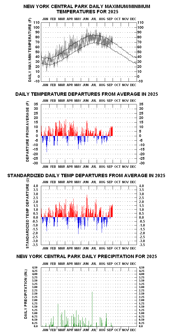 2025 Daily Temperature and Precipitation Graphs for NY Central Park (New 9/30/25)