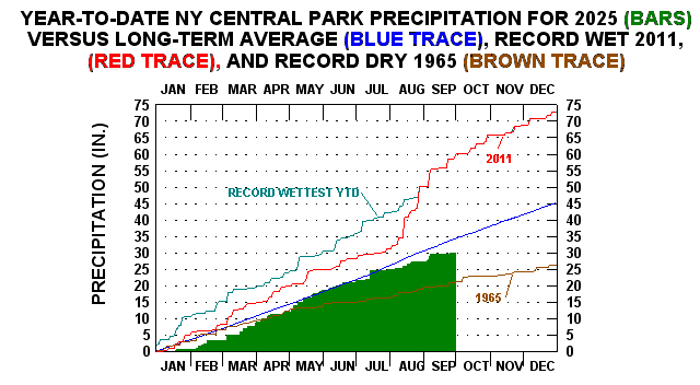 2025 NY Central Park Cumulative Daily Precip vs Normals & Extremes. New 9/30/25)