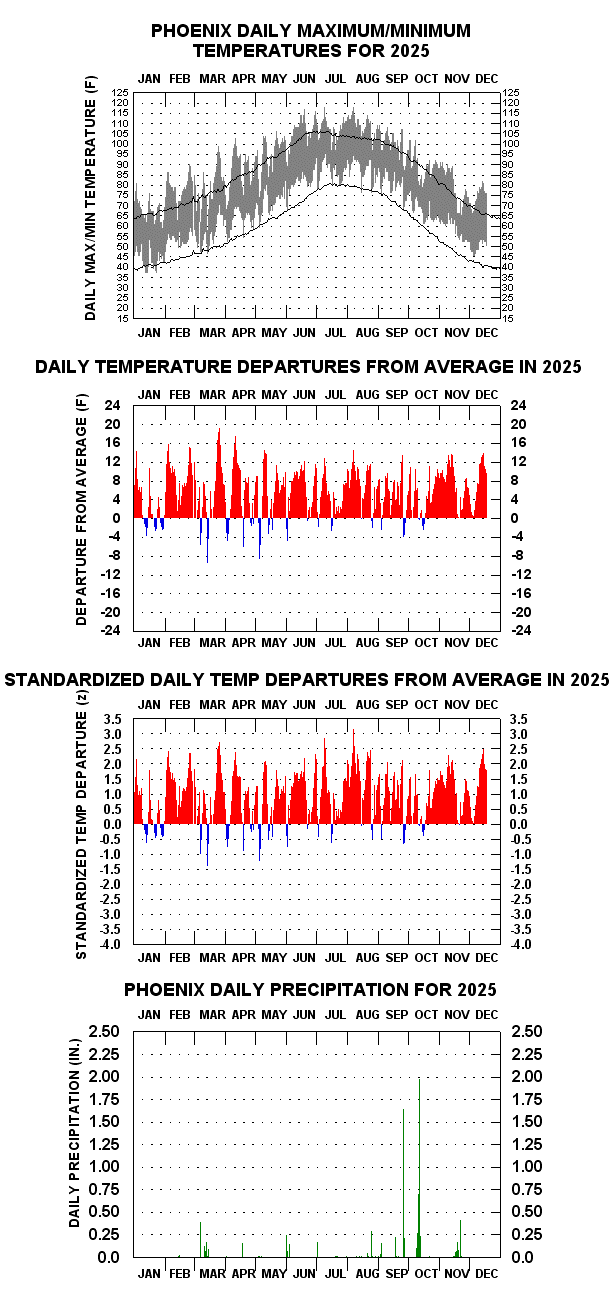 The following is a graphical climatology of Downtown Phoenix, Arizona temperatures and precipitation, from 1896 into 2025. Included are summary overview charts followed by 130-year-to-year graphs depicting daily temperatures, temperature anomalies, and rainfall for each and every year. The 1896-to-present period of record includes observations made by the Weather Service or affiliates from 1896 to May 1933, and at Sky Harbor Airport from June 1933 thereafter. The data were downloaded and processed from the NOAA National Center for Environmental Information (NCEI) and the NWS-Phoenix site (NOWDATA archives and F-6 reports).