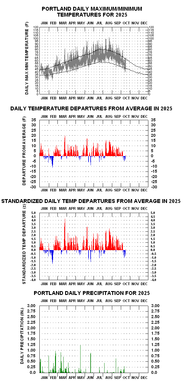 The following is a graphical climatology of Portland, Oregon temperatures and precipitation, from 1875 into 2025. Included are summary overview charts followed by 151 year-to-year graphs depicting daily temperatures, temperature anomalies, and precipitation.